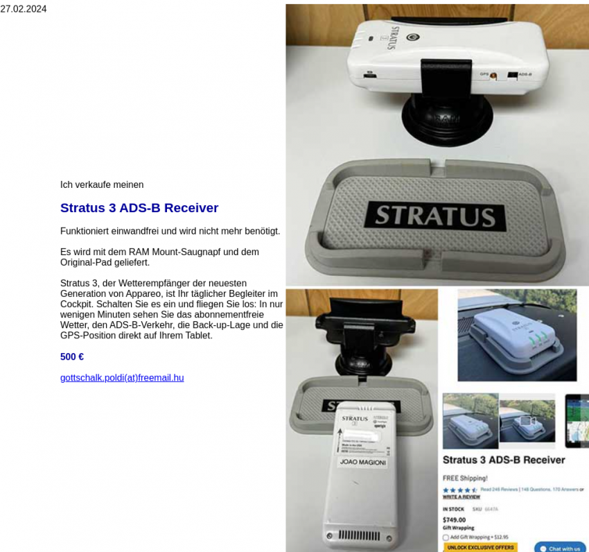 Nachdem ich auf der Suche nach einem Motorträger bin (hier und auf Helmuts UL) habe ich einige dubiose Angebote erhalten. Allerdings erst nach der - im Vergleich zum UL-Forum 3 Tage späteren Veröffentlichung auf Helmuts-UL Seiten. Seine Webseite ist nun einmal "die" UL-Plattform für An- u. Verkauf von Gebrauchtteilen.